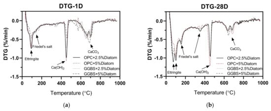 Effect of Diatom on the DTG results of cement paste, (a) 1D, (b) 28 D.