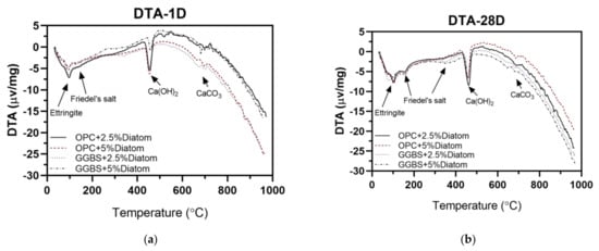 Figure 4 shows the effect of different diatom concentrations on the DTG results of the OPC and GGBS mixes after curing for 1 and 28 days. It can be seen that the main peaks correspond to ettringite (80–100 °C [,]), Friedel’s salt (120, 160 and 360 °C [,]), Ca(OH)2 (450 °C [,]) and CaCO3 (680–720 °C [,]), which agrees well with the crystals identified in XRD results (Figure 3). At 1 day, the peaks of ettringite and Ca(OH)2 in OPC mixes are higher than those in GGBS mixes in Figure 3 because the GGBS has a lower content of CaO and SO3 than OPC (from Table 1). At 28 days, it is interesting to see that the peak of ettringite in mix OPC + 5% diatom is much lower than that in mix OPC + 2.5% diatom—this could indicate that the amorphous nano-SiO2 in diatoms may facilitate the transformation of some ettringite to Friedel’s salt, which could be evidenced by the higher DTA peak (Figure 5) in the mix OPC + 5% diatom than that in the mix OPC + 2.5% diatom. The fluctuations in Figure 4 at the local range could be caused by the minimal impurities from the reaction between the trace amounts of other salts (except NaCl) and the OPC minerals or the organic parts in diatoms.