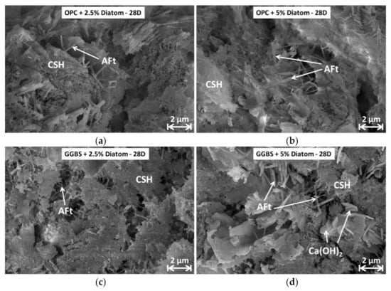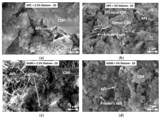 Figure 6 and Figure 7 show the microstructure under SEM observations of different OPC and GGBS mixes with 2.5% and 5% diatoms after standard curing for 1 and 28 days. The existence of ettringite (AFt), Ca(OH)2 and Friedel’s salt can be seen in different mixes. It is found that ettringite is more common than Friedel’s salt in the four cement pastes, indicating a higher amount of ettringite was formed than Friedel’s salt. This agrees well with the XRD results. It can be clearly seen that, in both OPC and GGBS mixes with 5% diatoms, there are two types of C-S-H [,,], namely low-density C-S-H (LD C-S-H) and high-density C-S-H (HD C-S-H).
