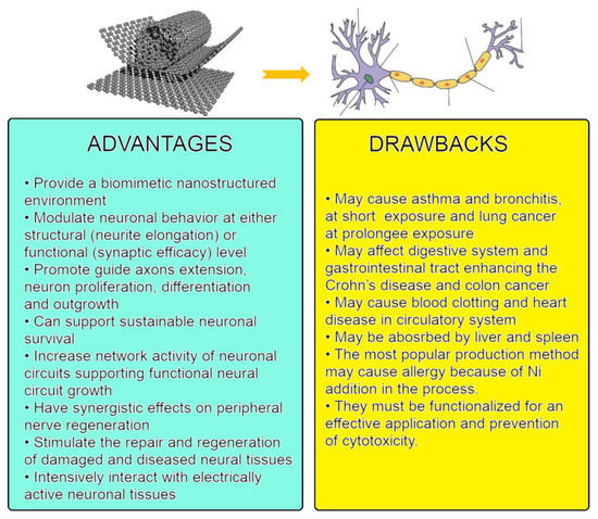 Scheme of anticipated interaction between carbon nanotubes and the nervous system: advantages and drawbacks. Figures on the top are from: (left) Michael Berger. Carbon nanotubes – what they are, how they are made, what they are used for. https://www.nanowerk.com/nanotechnology/introduction/introduction_to_nanotechnology_22.php (accessed on 28 September 2022); (right) Alex Bolano. Labeled Neuron Diagram. From: “Neuron” by US National Cancer Institute via WikiCommons CC BY-SA 3.0. https://sciencetrends.com/labeled-neuron-diagram/ (accessed on 28 September 2022).