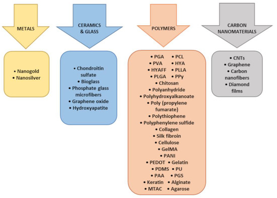 For implants, several material classes, like metals and alloys, solid and resorbable ceramics, bioglasses, polymers, carbon (and its organic derivatives), and many composite materials have been proposed [10], yet the nervous system needs specific materials. New synthetic and natural polymers are used most frequently to assemble the perfect scaffold enriched with some cells and growth factors, which can exactly mimic the extracellular matrix (ECM). Such a combination of biochemical, topographical, and electrical signals via various polymers, cells, and growth factors is considered the best solution for efficient regeneration [11,12]. The regarded strategies propose to develop a scaffold similar to the natural ECM that can provide an ideal environment for 3D cell cultures and is fully biocompatible and biodegradable [13]. However, the FDA approved until 2016 [3] only polyglycolic acid (PGA), PCL polycaprolactone, collagen, and polyvinyl alcohol (PVA). Other polymers have been investigated for neurosurgery aims and they include natural compounds such as hyaluronic acid (HA), the benzyl ester of hyaluronic acid (HYAFF), and synthetic polymers such as PLLA (polylactide of lactic acid), PLGA (poly(lactic-co-glycolic acid), polypyrrole (PPy), chitin, and chitosan, polyanhydride, polyhydroxyalkanoate, poly (propylene fumarate) and polyvinyl alcohol [6,9,13,14], (poly(3,4-ethylene dioxythiophene) (PEDOT) [15], and some others which are still under study. Such strategies look reasonable if the nerve conduit implant is designed to undergo a complete transformation. As polymers have several drawbacks, polymer-based composite materials have also been proposed for nerve tissue engineering, including recently bicomponent 3D scaffolds consisting of collagen and chondroitin sulfate [16] and antibacterial cellulose-based composites [17].