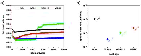Figure 1a shows the COF under vacuum environment sliding. The average COF is calculated from the steady state region which varied with changes in the N-alloying. The WSx pure coating displayed the highest COF of 0.04. The steady state region considered during this average calculation is from 5000 to 10,000 cycles. The coating with the lowest nitrogen concentration i.e., WSN5 coating, displayed the lowest friction coefficient. The average steady state COF is 0.02, with the steady state region lying between 1000 and 10,000 cycles. The WSN12.5 coating that displayed the best sliding properties in room temperature humid air, 200 °C and dry nitrogen sliding displayed the worst frictional properties in vacuum. From 500 to 5000 cycles, the COF was ~0.02 but after 5000 cycles, a sudden increase to ~0.05 was observed. The final steady state average COF of this coating was 0.05 (considered between 5000 and 10,000 cycles). The highest N content coating’s steady state region lied between 4000 and10,000 cycles with an average COF of 0.03.