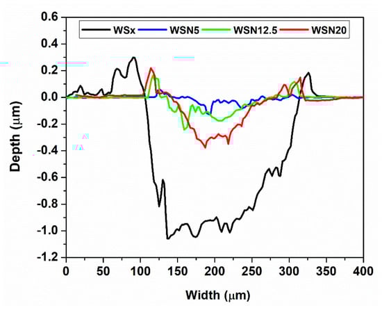 Unlike the COF, the specific wear rate of the W-S-N coatings displayed a linear increase with increasing N concentration (Figure 1b). The pure coating displayed the highest wear rate of 1.1 × 10−6 mm3/Nm. After N introduction, the specific wear rate suddenly drops one order of magnitude, showing the beneficial influence of N-alloying. From the lowest to the highest N content, the specific wear rate progressively increased with the highest value of 2.4 × 10−7 mm3/Nm being achieved by WSN20. The lowest value of 3.7 × 10−8 mm3/Nm was observed for the WSN5 coating. The values of the specific wear rates corroborate the 2D cross-section profiles of the wear tracks, as shown in Figure 2. The evolution of the 2D profiles depicts an abrasive wear mode for all the coatings. Additionally, the accumulation of the wear debris on the sides of the wear tracks is also visible. This wear debris accumulation is a common feature shown by alloyed-TMD coatings.