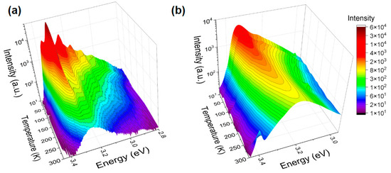 Temperature dependencies of PL spectra for: (a) as-received commercial ZnO NPs and (b) as-grown ZnO MPs.