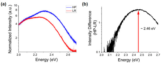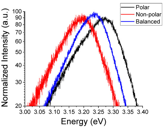 Significant differences appear at higher energies, especially when subtracting the two spectra (Figure 4b). One can see for the more polar morphology a pronounced increase of the intensity of the emission band centered at ~2.46 eV. This peak is commonly attributed to oxygen deficiency [39]. This observation is consistent with the observed shifts in the NBE peak energy shown in Figure 3, whence the presence of such deficiency and the previously noted abundance of surface trap states would suggest an excess of Zn2+ ions at the polar surfaces of ZnO MPs. Thus, this is an indication of chemical and electronic distinction of the polar surfaces from their non-polar counterparts.