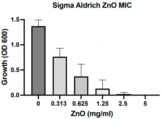 All of the samples studied here were exposed to S. aureus bacteria. OD600 results from MIC assays with ZnO NPs are depicted in Figure 5. We find that nanoscale particles exhibit an MIC at ca. 2.5 mg/mL, which is comparable to the MIC previously reported for our hydrothermally grown ZnO microparticles [29]. It should be noted that those results do not indicate differences detectable at this stage in antibacterial action for samples of different synthesis origins and morphological nature.