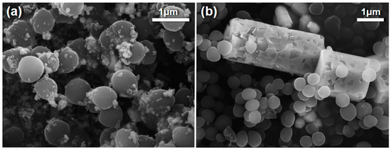 FE-SEM images comparing the differences in bacterial interaction of S. aureus with the free crystalline surface of differing scales of ZnO in MHB where (a) shows interaction with commercial ZnO NPs and (b) shows interactions with hydrothermally grown ZnO MPs [29].
