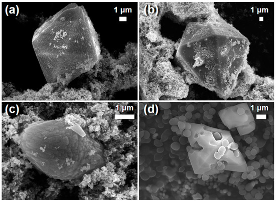 FE-SEM images of secondary crystalline phases in solutions with: (a) commercial ZnO NPs after exposure to PBS in isolation; (b) commercial ZnO NPs after exposure to PBS with S. aureus; (c) commercial ZnO NPs after exposure to saline with S. aureus; (d) hydrothermally grown ZnO MPs after exposure to MHB with S. aureus.