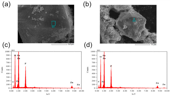 The secondary crystalline phase crystals are found in all biological environments utilized in this study except the saline solution without bacteria. It should be noted that only a very small concentration of such crystals was observed in saline environments containing S. aureus. We find that the quantity of these crystals is increasing with the concentration of aqueous phosphates. The secondary crystalline phase is the most prevalent in PBS containing S. aureus. This lines up well with the EDXS results shown in Figure 8. Here, one finds significant concentrations of Zn, O and P with residual carbon from the tape utilized in mounting for SEM. Obviously, phosphorus is not originally present in saline media in any appreciable quantity. The morphology and chemical composition of these pyramidal crystals are indicative of monoclinic zinc phosphides [44,45,46] though further structural studies are needed to confirm their exact nature. Observation of such crystalline phases has been reported previously for ZnO NPs within metal–organic frameworks [47]. In those studies, the phosphorus-containing phase was classified as zinc phosphate hydrate, was present at negligible abundances and thus was not the focus of the discussion about its effect on antibacterial action. Moreover, this phase was present in a form of a relatively random assortment of nanoscale morphologies as opposed to the pyramidal microparticles observed herein.