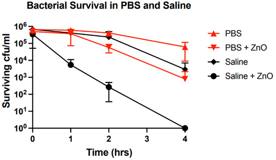 This blue shift may also be attributed to adsorption of aqueous phosphate molecules and complexes to surface trap states. As discussed previously, this would result in the passivation of these states and would influence the surface band bending. Despite this change, the effects of bacteria would remain the same as in the case of NPs where a negligible effect is observed in saline environments and a notable reduction of this shift in PBS. This suggests identical interactions of bacteria, either with ZnO or with those media components responsible for the observed shift in PBS. It is known that S. aureus requires phosphates for certain metabolic processes [49,50]. Therefore, bacteria may actively desorb the adsorbed phosphorus-containing compounds from the ZnO surfaces. It can be concluded that bacteria may be interacting with and thereby freeing the surface traps occupied by aqueous phosphates or merely consuming compounds involved in their passivation. This model supports the idea of competitive interactions between bacteria and PBS with ZnO.