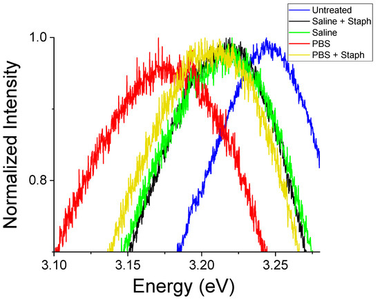 Further evidence of such competitive interactions is seen in the room temperature PL spectra of ZnO particles after exposure to these biological environments. At both the nano- and microscale we observe significant shifts in the NBE peak luminescence energy. For ZnO NPs (Figure 10) we observe a redshift in the NBE emission at RT for both saline and PBS environments with and without the presence of S. aureus. Spectra for saline environments exhibit a minor shift of ~25 meV with little to no difference observed in the presence of S. aureus. For the case of PBS, a larger shift of ~100 meV in the peak energy is observed and the presence of bacteria has a more significant impact. In this environment, the addition of S. aureus reduces the observed shift to only ~50 meV.