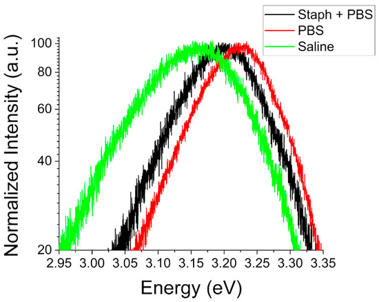 Room temperature PL spectra of the NBE region normalized to the NBE peak intensity for a type B ZnO MP sample after exposure to S. aureus in PBS as well as PBS and saline media in isolation.