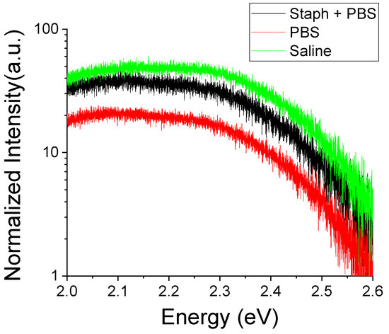 Room temperature PL spectra of deep defect luminescence regions normalized to the noise floor for a type B ZnO MP sample at 300 K after exposure to S. aureus in PBS as well as PBS and saline media in isolation.