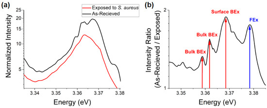 10 K PL spectra of: (a) excitonic recombination for commercial ZnO NPs normalized to the noise floor before and after exposure to S. aureus bacteria in MHB growth media and (b) the ratio of the spectra shown in part (a).