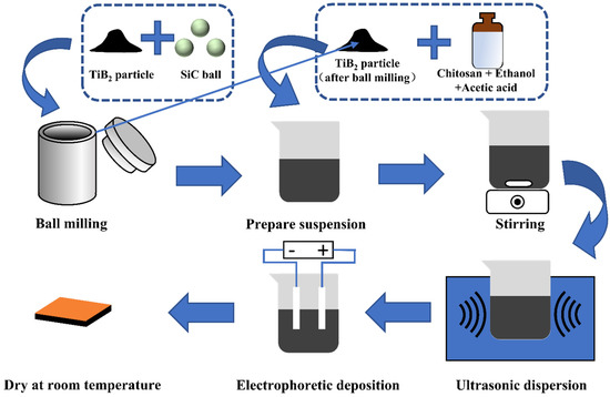 EPD coating was prepared by depositing charged particles of the suspension on the surface of the workpiece under the action of an external electric field [7]. Because it is not affected by the surface shape of the workpiece, and the thickness of the coating is uniform, it is widely used in industrial and medical fields. According to the previous study [8,9,10,11], the conductivity, concentration of the suspension, the charge density of the particle surface, and relative parameters of the electric field can influence the result of the EPD. The composition of the coating also has a great impact on EPD. The ceramic material can be used as the coating material due to its good mechanical properties and corrosion resistance. The application of ceramic includes high-temperature structural materials, cutting tools, and weapon armor materials [12]. Among them, TiB2 has high thermal stability, high hardness, high modulus of elasticity, and high electrical conductivity [13]. Now, TiB2 coating has been used to improve the abrasion resistance of materials. The wear resistance and mechanical properties of TiB2 coating were investigated by many researchers [14,15]. The results proved that the TiB2 coating can enhance the wear resistance and prolong the service life of tools. Many scholars have also tried to use EPD to prepare TiB2 coatings. However, it is hard to form the stable suspension with TiB2 particles. Then, the researchers [16,17,18] found that Chitosan can be used in the process of EPD, which can promote the deposition of the particles. The research shows that Chitosan can act as a linking agent in the EPD process of particles and achieve the uniform and efficient deposition of particles. Chitosan is one of the cationic polymers, as a natural amino polysaccharide, it dissolves in the acidic environment [19]. Now, Chitosan has widely used in pharmaceutical and industrial fields and widely used in the manufacture of composite coatings [20,21,22]. By using the Chitosan, the researcher [23] has successfully prepared TiB2-Chitosan coating on the titanium surface.