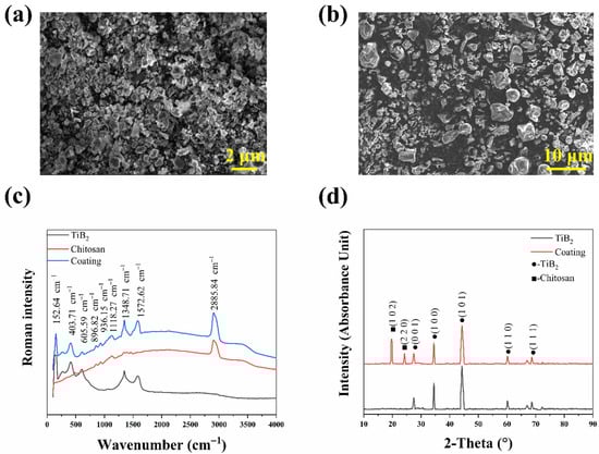 (a) Microstructure of the TiB2 particles, (b) Microstructure of Chitosan, (c) Raman spectroscopy of powders and coating, (d) The XRD pattern of the TiB2 and coating.