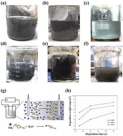 The suspensions with different concentration of TiB2 and Chitosan: (a) 2.5 g/L TiB2 and 0.5 g/L Chitosan, (b) 5 g/L TiB2 and 0.5 g/L Chitosan, (c) 10 g/L TiB2 and 0.5 g/L Chitosan, (d) 2.5 g/L TiB2 and 1 g/L Chitosan, (e) 5 g/L TiB2 and 1 g/L Chitosan, (f) 10 g/L TiB2 and 1 g/L Chitosan (g) The mechanism of the EPD, (h) The deposition weight of different samples.