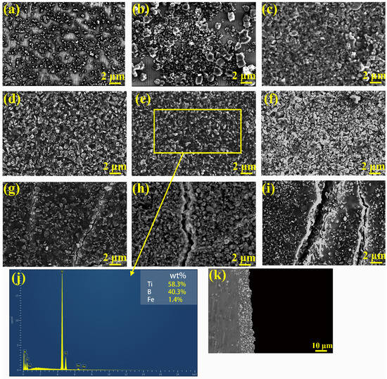 It can be observed that some areas are not coated when the deposition voltage is set at 20 V (Figure 4a,b). This is because lower deposition voltages do not have enough mobility for the particles to deposition. Then with the prolong of deposition time, the coating begins to cover the substrate, as shown in Figure 4c. When deposition voltage increases to 40 V (shown in Figure 4d–f), a uniform and dense coating can be observed on the substrate. Under measurement, the mass ratio of TiB2 and Chitosan in the layer is approximately about 0.98. When the deposition voltage reaches 60 V (shown in Figure 4g–i), cracks can be observed on the surface of the TiB2-Chitosan coating. The cracks become wider with the increase of the deposition time.