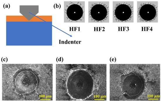 (a) Schematic diagram of the indentation test, (b) Indentation image for acceptable adhesion strength. The indentation pattern of (c) sample with 40 V 30 s (d) sample with 40 V 60 s, and (e) sample with 40 V 120 s.