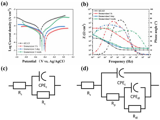 The corrosion behavior was investigated through the immersion test in 3.5% NaCl solution. Figure 6a shows the Tafel polarization curves with different immersion times. As shown in the polarization curves, it can be obviously seen that the samples with coating show better corrosion resistance. The corrosion potential (Ecorr) and corrosion current density (icorr) of different samples are shown in Table 2. The icorr was calculated by the Tafel extrapolation. The maximum value of Ecorr corresponds to the sample immersed for 1 h, and the values of Ecorr decrease with the prolongation of soaking time. The corrosion resistance of the material decreases gradually with the prolongation of immersion time. The Ecorr of the coated samples is higher than the −0.512 V of the original sample (without coating on it). With the prolongation of immersion time, the icorr of the coated samples decreased from 8.75 × 10−5A·cm−2 to 1.37 × 10−5A·cm−2. Generally, the larger the Ecorr and the smaller the icorr, the better the corrosion resistance of the material. From the results, the coating can effectively improve the corrosion resistance of 6Cr13 MSS.