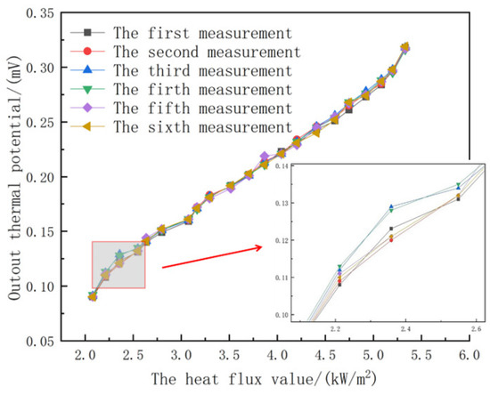 | Heat Flux kW/m2 | The First Test/mV | The Second Test/mV | The Third Test/mV | The Fourth Test/mV | The Fifth Test/mV | The Sixth Test/mV | Repeatability Error |