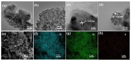 By using the NSG technique, it is facile to obtain plate-like particles under various conditions, and the particles show similar morphological and element features. As shown in Figure 1a,b, the samples are a sheet structure and are covered with particulate matter. The lattice spacing of 0.24 nm and 0.35 nm in Figure 1c,d corresponds to the (103) and (101) planes of anatase type TiO2, respectively, evidencing the formation of anatase TiO2.The EDS analysis shows that all the samples consist of Ti, O and F elements, as shown in Figure 1e–h. Obviously, the contents of Ti and O distribute uniformly. In addition, the F content in all the samples under various conditions is ~1.1 mass%, which is due to the residual element from the precursor solution [23,24].