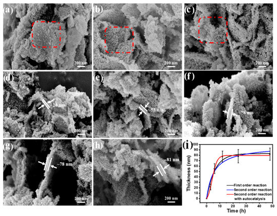 SEM images of the prepared samples with different synthesis times: (a,d) 3 h, (b,e) 6 h, (c,f) 12 h, (g) 24 h and (h) 48 h. (i) Fitting curves to the sample thickness. Red circles highlight the surface characteristics.