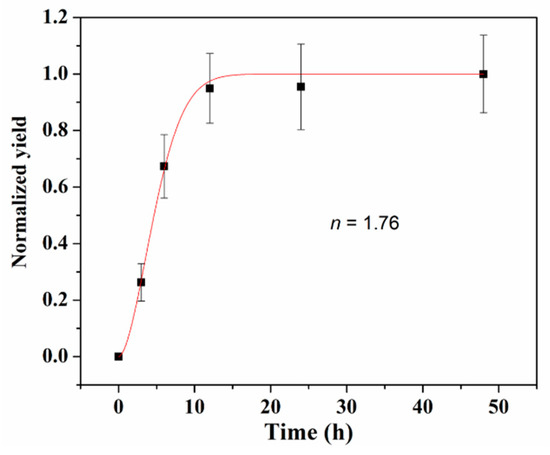 The XRD patterns shown in Figure S1 show all the samples with a good crystallinity. It can be calculated by the Scherrer formula that the crystallite sizes with different synthesis times are 11.8 nm, 11.5 nm, 12.6 nm, 12.7 nm and 13.4 nm, respectively. The crystallite size increases slightly with the change in synthesis time. We employed the Johnson–Mehl-Avrami–Kolmogorov (JMAK) model to obtain the details of the crystal growth, and the fitting shown in Figure 3 yields an Avrami kinetic exponent n of 1.76. The Avrami kinetic exponent is a decimal between 1 and 2, suggesting that the crystallization process on nanosheets is a combination of one-dimensional and two-dimensional growth. In order to visualize the crystal growth of TiO2 on nanosheets, the deposition was also conducted on Langmuir–Blodgett fabricated nanosheet thin films, and the surface configuration was studied by AFM. The AFM results (Figure S2) show that the thin film becomes thicker and thicker (Figure S2a–h), and the surface is smooth at the initial stage of the deposition (roughness: 0.17 nm at 2 h) and becomes rougher and rougher with time (Figure S2i–l). So, it is concluded that the growth of TiO2 on the Ti0.87O2 nanosheet follows the Stranski–Krastanov growth mode [25,26,27].