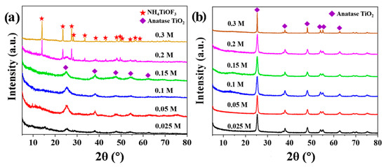 Figure 5 shows the XRD patterns of the samples before and after calcination at 450 °C. When the concentration of (NH4)2TiF6 is less than 0.2 M, the prepared sample is anatase TiO2 (JCPDS 21-1272), as shown in Figure 5a. However, when the concentration of (NH4)2TiF6 is 0.2 M, the phase of the prepared sample is TiO2 and NH4TiOF3. As the concentration of (NH4)2TiF6 further increases to 0.3 M, the phase of the prepared sample is only NH4TiOF3. This phenomenon is also reported in a previous report [28]. However, all the annealed samples are anatase TiO2, and the prepared samples have good crystallinity (Figure 5b). When the concentration of NH4TiOF3 increases from 0.025 M to 0.3 M, after calcination, the crystallite sizes of TiO2 are 15.5 nm, 15.0 nm, 12.7 nm, 13.4 nm, 15.1 nm and 46.4 nm, respectively. The much larger crystallite size of the latter one can be explained by the disc-like structure, while the others are plate-like structures (Figure 4e).