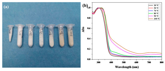 Interestingly, the color of the prepared samples changed from white to light yellow as the synthesis temperature increased (Figure 8a). The UV–vis diffuse reflectance spectra of the samples, as shown in Figure 8b, demonstrate that the white samples show strong absorption in the UV region, and the optical absorption wavelength was consistent with that of TiO2. The light yellow samples show strong absorption in the UV region as well as extra absorption in the visible light region (400–600 nm). The absorption peaks at 450 nm and 700–800 nm are attributed to the existence of the oxygen vacancy and the reduced Ti3+ ions, respectively [35]. Obviously, simply increasing the synthesis temperature can enhance the absorption of the samples in the visible light region while keeping the phase composition unchanged as anatase TiO2 (Figure S5). This strategy may find applications in photocatalysis to address energy and environmental challenges through light-chemical conversion processes [36].