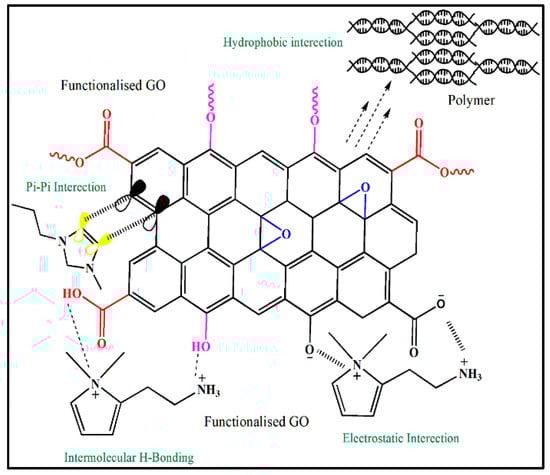 There are several non-covalent functionalization methods using several approaches. Hydrophobic and electrostatic interactions, van der Waals forces of attraction between molecules, and a bundled assemblage conforming to a condensed state feature strongly in the commonly used non-covalent functionalization approaches that are applied to carbon allotropes [41,42]. Non-covalent functionalization provides useful routes to alter surfaces, thus permitting surface functionalization without chemical disruption of the surface structural framework of the carbon allotrope and resulting in changes to the physical and electrical properties following functionalization. Graphene analogues, such as single-walled carbon nanotubes (SWCNTs) and multiwalled carbon nanotubes (MWCNTs) have, in recent years, undergone non-covalent functionalization. It is generally observed that in this mode of interaction, the πe− density of the benzene ring(s) (e.g., pyrene and perylene) to some degree overlaps with the πe- region of the carbon allotrope. Several non-covalent functionalization routes of GO can be seen in Figure 2. The aromatic regions of carbon allotropes are often directed to undergo π-π stacking associations. Interfaces between carbon allotropes (with supermolecules, surface-active agents, ionic liquids, etc.) can be categorized as hydrophobic. The π–π cooperativity has been reported to occur in polymers such as Kevlar [43], polyvinyl chloride, sulfonated polyaniline [44], and polyethylene glycol [45]. To investigate the electron–donor–acceptor interactions in aromatic compounds with graphene nanosheets, pyrene and perylene diimide derivatives were used. Carbon allotropes (G, GO, CNTs, etc.) work together hydrophobically with supermolecules, ionic liquids, and surfactant molecules to form stacked configurations on carbon allotropes and differ from the stacked orientation used by aromatic compounds on carbon allotropes. Both aqueous and organic solvents disperse carbon allotropes by virtue of their dispersion strength arising from chemical interactions between the carbon allotrope and the solvent environment. Electrostatic interactions play a large role in the interaction between ionic liquids and GO (conceivably with different allotrope types), in part because GO contains a variety of ionic groups, such as hydroxylates and carboxylates, which can engage in electrostatic interactions. Hydrogen bonding is not only capable of stacking and hydrophobic and electrostatic interactions but can also occur between allotropes of carbon in addition to stacking.
