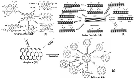 (a) A scheme showing the modification of graphene and GO using commonly applied functionalization chemical/physical strategies. (b) Surface functionalization of carbon nanotubes. (c) Surface functionalization of fullerene.