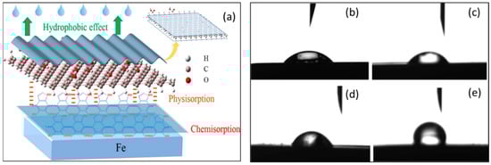 Recently, covalent modifications and self-polymerization have been used to functionalize graphene oxide (GO) with polydopamine (PDA), which was then tested as a corrosion inhibitor in HCl solutions against carbon steel. At 100 mg/L, GO-PDA achieved almost 90% inhibition efficiency, which is a high level of corrosion protection for carbon steel. An investigation of the interaction between immersion time and concentration was conducted. A hydrophobic film was formed in micro–nano structures by lamellar functionalized GO adsorbed onto the surface of carbon steel [48]. The composite carbon material of this dense protective film was extremely hydrophobic, inhibiting the penetration of corrosive agents, as shown in Figure 4a. In this study, a transition from a GO-surface that had a negatively charged surface to a positively charged GO-PDA that significantly enhanced the adsorption at the material intersection. The contact angle measurement study, as shown in Figure 4b–e, evidently showed that the GO-PDA cover layer was hydrophobic in nature, which was corroborated by contact angle measurements at the interface.