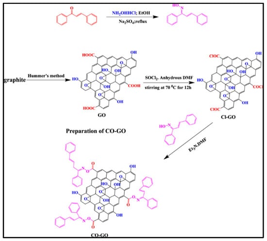 Scheme for the synthesis of chalcone oxime (CO)-functionalized graphene oxide. Reprinted with permission from [72] 2022 ACS Publ.