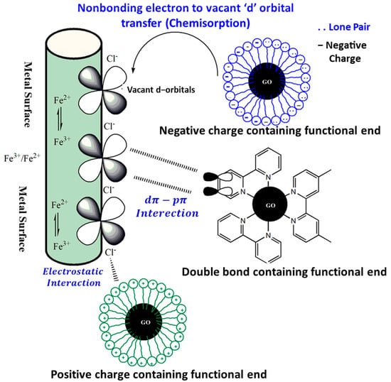 Electrostatic force of attraction is another means of interfacing functionalized nanomaterials with metallic surfaces besides chemical (coordination) bonding by means of physisorption. The adsorption of counter ions on positively charged metallic surfaces in aqueous electrolytes incite a negative charge to the metallic surface. In a separate event, protonation of a functionalized nanomaterial inhibitor group induces a positive charge and drives an electrostatic force of attraction to the negatively charged metallic site, resulting in the induction of physisorption. Figure 6 depicts chemisorption and physisorption in a pictorial manner. The most common mechanism for adsorption of organic corrosion inhibitors is the mixed mode, also known as physiochemisorption. GO and its derivatives are described in this article for their corrosion-inhibition properties.