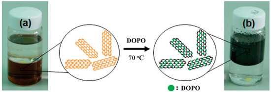 The boundary region and basal planes of GO forming the graphene precursor constitute an abundance of epoxy, hydroxyl, carboxyl, and -C=C- groups which are freely available for functionalization [73]. Surface conversion of hydrophilic GO to its congruent hydrophobic state facilitates the dispersion of graphene sheets in the polymer matrix, as shown in Figure 7 [74]. The functionalization-based approach has been successfully applied in order to prepare organic flame retardants with functionalized graphene. With the help of this strategy, it is generally possible to covalently link organic flame retardants to graphene or GO in two steps: (i) Providing organic flame retardants with functionalities to enable their reaction with graphene or GO and (ii) reducing functionalized graphene to functionalized graphene using reducing agents. Modifiers that also serve as reducing agents can occasionally functionalize and reduce GO at the same time. A few examples of organic flame retardants functionalized with graphene, as well as the polymer composites that contain these materials, are summarized in Table 2.