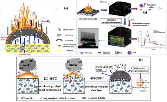 (a) Flame-retardant mechanisms in FGO/EP. Reprinted with permission from [87] 2020, Eur. Polym. J. (b) an EP-composite flame-retardant-mechanism model. Reprinted with permission from [88]. 2019 Carbon and (c) graphene-based EP/APP composites with flame-retardant mechanisms. Reprinted with permission from [89]. 2019, Compos. Part B Eng.