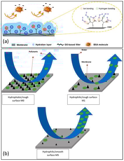 (a) Scheme showing that hydrogen and ionic bonding sites can be provided by cysteine-functionalized graphene oxide to the PES membrane to inhibit protein adsorption. Reprinted with permission from [1]. 2020, J. Ind. Eng. Chem. (b) the mechanism by which protein fouls the water during the cleaning process. (GO: 1 weight percent; Cs-GO: 1 weight percent, neat PES membrane). Reprinted with permission from [92]. 2018, J. Ind. Eng. Chem.