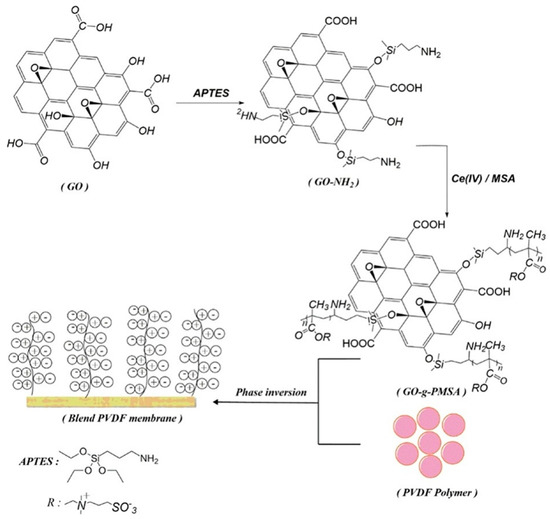 The antifouling properties of zwitter ionic surfaces are effective in protecting surfaces against foulants. The modification of graphene oxide with zwitter ionic groups (GO-g-PMSA) and its incorporation into polyvinylidene fluoride (PVDF), as shown in Figure 11, generates two advantages: it increases the graphene oxide dispersibility in the membrane matrix and supplements GO with an increased antifouling capability. Water empathy and surface hydrophilicity of PVDF hybrid membranes were significantly improved by incorporating the zwitterionic additive. GO-g-PMSA/polyvinylidene fluoride membranes showed improved antifouling properties in comparison to pure polyvinylidene fluoride and graphene oxide–polyvinylidene fluoride membranes as it made use of softer and more hydrophilic properties. In the experiment, 1 wt% wt% of GO-g-PMSA/PVDF membrane showed superior antifouling performance. The study employed buffer solutions composed of phosphates in 1 g/L BSA and FRR was 95.3%, Rr was 32.3%, and Rir was 4.7% at 0.7 MPa. Furthermore, high salt-ion refusal was noted in the salt-rejection experiments. The findings confirmed that zwitter-ionic-polymer-modified GO can potentially be used as an antifouling additive in nanocomposite membrane fabrication [93]. CNT coatings have been shown to prevent and control marine biofouling in several studies so far. These coatings consist primarily of MWCNTs, which have shown efficacy in marine environments, according to Table 3.