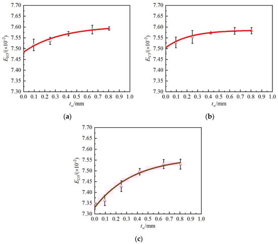 Relationship between energy values of the sub-images obtained after applying the three-level wavelet transform and corrosion depths: (a) EH3-tw, (b) EV3-tw, (c) ED3-tw.