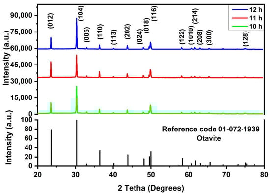 The films obtained resulted thick, homogeneous, uniform, and with good adhesion to the Corning glass substrate. Figure 1 displays theXRD patterns of CdCO3 films deposited at 10, 11, and 12 h. At the bottom, the XRD pattern of the crystallography reference for CdCO3 in its mineral phase (otavite) is shown. The diffraction peaks of the reference match well with the XRD patterns of the films synthesized; according to the reference, it has a rhombohedral crystalline structure and a preference plane (104) at about 30°. The peak intensity at different times of deposition does not illustrate a significant change in the diffractograms; only peaks (012), (104), and (110) seemed to increase in intensity, and the formation of impurities was not observed. Furthermore, the crystallite size was calculated according to the Debye–Scherrer equation (Equation (1)).