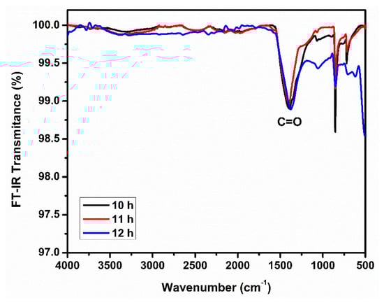 FTIR transmission spectra of the CdCO3 samples deposited at 10, 11, and 12 h.