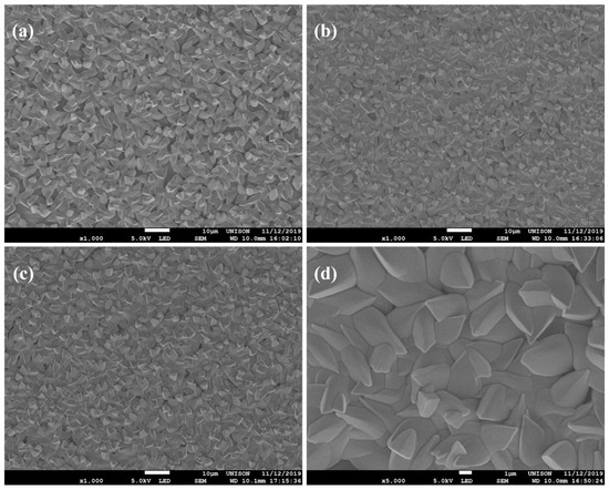 The morphologies of the samples are shown in Figure 4 and labeled as (a), (b), and (c), corresponding to films deposited at 10, 11, and 12 h, respectively. Figure 4d exhibits a close-up of the morphology of the sample at 11 h to observe its shape and size. It can be seen that the entire surface area of the substrate was covered; as the deposition time increased, the morphology became more uniform and denser. The size of the microstructures was around 3–5 µm, with a deltoid shape, agglomerated and distributed randomly for all samples. In a previous study [15], the morphology revealed agglomerated clusters with a butterfly cocoon shape. The difference in these morphologies is attributed to the optimized formulation and conditions to synthetize CdCO3 films since temperature was reduced from 70 to 50 °C and bath time incremented from 1 to 3 h. The effect of reducing the temperature in combination with the double molarity of sodium citrate produced a decrease in the deposition time, due to a higher proportion of cadmium ionic complexes, which led to a more controlled, uniform, denser, and rapid formation of the film on the substrate. However, in the literature, different morphologies are reported, depending on the conditions and methods of synthesis, yielding many forms [23,24].