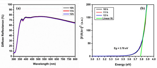 (a) Diffuse reflectance spectra and (b) direct bandgap of the CdCO3 films deposited at 10, 11, and 12 h.
