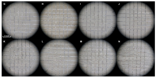 The adhesion of geopolymer suspensions to the substrate was analyzed by the grid test method according to ISO 2409, specifically with the Elcometer 1542 grid test set. The knife used had a blade spacing of 1 mm for coatings, with a thickness of 0–60 μm. We can observe the result of the analysis at Figure 5 and the evaluation is conducted in Table 6. Except for suspension H, which achieved a rating of 2, all other suspensions were rated 1, i.e., very small separation of the coating along the sections with an area not exceeding 5% (on the details in Figure 5 is visible aluminum substrate extruded around the cuts). Sample H with a rating of 2 shows a larger area of detached coating by 5%–15%. The results show that the adhesion of the used geopolymer suspensions to the underlying aluminum alloy substrate is at a very high level.