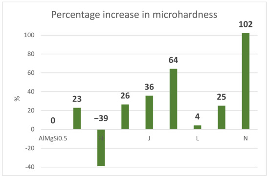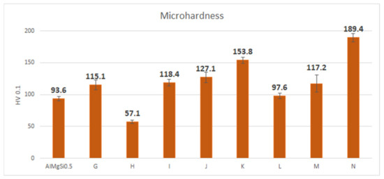 - In the measurement of microhardness, suspension N reached the highest value of 189.4 HV 0.1, which is a 102% increase compared to the microhardness of the underlying AlMgSi0.5 substrate, which reached 93.6 HV 0.1. Except for suspension H (57.1 HV 0.1, a decrease of −39%), all suspensions achieved higher microhardness against the substrate.