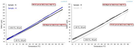 The first curve of subcooling and heating for sample K was already described in the initial graph, as shown in Figure 13, but the functionality of the coating during repeated loading is clearly evident from the cyclic thermal load. If we compare the curves with the reference sample without the coating, we see a drastic decrease of the elongation under repeated thermal stress. It is also important to mention the shrinkage value of the sample during subcooling, i.e., at a temperature of −20 °C. The sample with the coating achieved greater shrinkage during subcooling during the second cycle, and if we compare the maximum elongation at a temperature of 400 °C, there is also a noticeable effect of the coating during cyclic thermal loading; a reduction of elongation by almost 10 µm.