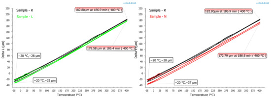 In terms of the increase of elongation depending on the increasing temperature, sample N shows the best values, which reach fascinating values, even during repeated thermal loading. Since there are no fluctuations in the waveforms, it is clear that cracking of the coating has no effect on the functionality of the coating. Practically the entire process shows a decrease of thermal expansion. The linear course, even in values below the reference sample, is very favorable. It is also important to notice what elongation values the sample acquired at a negative temperature of −20 °C. However, the benefit is rather the value of the increase at 400 °C, which is more than 10 µm smaller than that of the reference sample. According to the results, the coating improves its effect on the reduction of thermal expansion after repeated temperature loading, which is a very favorable finding for industrial use.