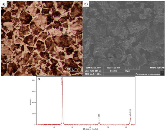 The microstructure of the surface and the diffractogram of 30CrMnSiA steel before EPTCH are shown in Figure 2a–c. As shown in the optical and SEM micrographs, the main phase component of the initial state of 30CrMnSiA steel is ferrite and pearlite [36]. Figure 2 a,b shows that the interplate distance of ferrite (light) and pearlite (dark) looks different depending on the angle to the surface. The thickness of the plates is beyond the resolution of the lenses of an optical microscope, so the grains of pearlite after etching with a 4% solution of nitric acid are colored in dark light [37]. The phase composition of 30CrMnSiA steel samples before EPTCH is investigated. In Figure 2 a diffractogram of 30CrMnSiA steel is presented, and according to X-ray diffraction analysis in the initial state, 30CrMnSiA steel implies an α-Fe phase with a BCC lattice.