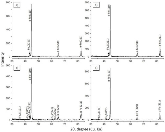 The determination of morphological phase components of structures in the material is undoubtedly an important task for establishing the optimal mode of hardening of the EPTCH, which can be implemented using X-ray diffraction analysis methods on an X-ray diffractometer. Figure 3 illustrates the results of the obtained diffractograms of 30CrMnSiA steel samples treated with EPTCH according to the modes No. 1, No. 2, No. 3, and No. 4. As shown in Figure 3a–d, the phase structure of 30CrMnSiA steel mainly implies of α’–Fe and Fe3C grains, which are α’-martensite and Fe3C–cementite (iron carbide), as well as the broadening of interference lines from the crystallographic plane (110). The broadening of the interference lines of the plane (110) and the increase in their relative intensity are presumably associated with an increase in the density of dislocations during the formation of martensite and is determined mainly by the tetragonality of martensite, which is consistent with the results reported by other authors [42,43,44]. However, it is known that with the help of X-ray diffraction analysis, it is possible to detect the presence of any phase with its content in the amount of at least 2%, and to identify phases in smaller quantities, it is necessary to use other methods of analysis.